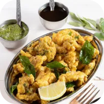 Golden fried chicken tenders with a spiced masala blend and cilantro dip.
